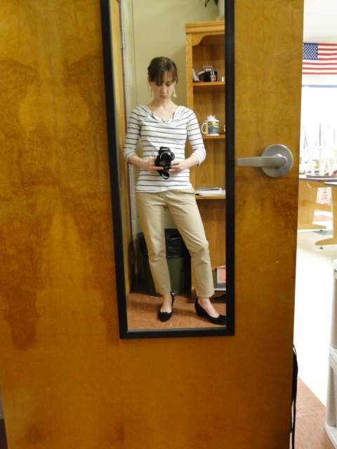 Day 1: We had some warm, sunny weather for once, woohoo! So I busted out a light stripey number and wore it sans tights for the first time. I also brought along a fun wristlet, because I was taking my students outside and needed a place to stash my cell (I have to keep it with me at all times because of Violet's allergies) and some cough drops and tissues (still getting over bronchitis here).